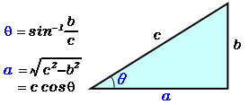 \(\normalsize Right\ triangle\\ (1)\ \cos\theta={\large\frac{a}{c}}\ ,\hspace{20px}\sin\theta={\large\frac{b}{c}}\ ,\hspace{20px}\tan\theta={\large\frac{b}{a}}\\ (2)\ Pythagorean\ theorem\\ \hspace{40px} a^2+b^2=c^2\\ \)