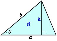 \(\normalsize Triangle\ (a,b,\theta\rightarrow S)\\ (1)\ area:\hspace{50px} S={\large\frac{1}{2}}ab {\hspace{1px}} \sin{\theta}\\ (2)\ perimeter:\ L=a+b+\sqrt{a^2+b^2-2ab{ {\hspace{1px}} \cos{\theta}}}\\ (3)\ height:\hspace{40px} h=b\hspace{2px} \sin{\theta}\\ \)