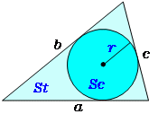 \(\normalsize Incircle\ of\ a\ triangle\\ (1)\ incircle\ radius:\hspace{5px} r={\large\frac{\sqrt{s(s-a)(s-b)(s-c)}}{s}}\\ (2)\ incircle\ area:\ Sc=\pi r^2\\ (3)\ triangle\ area:\ St=\sqrt{s(s-a)(s-b)(s-c)}\\ \hspace{230px} s={\large\frac{a+b+c}{2}}\\\)