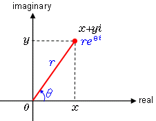 \(\normalsize (1)\ Cartesian\ coordinates:\ x+yi\\ \hspace{60px}x=r\cos\theta,\hspace{20px}y=r\sin\theta\\ (2)\ Polar\ coordinates:\ re^{{\theta}i}\\ \hspace{60px}r=\sqrt{x^2+y^2},\hspace{20px}\theta=\tan^{\small-1}{\large\frac{y}{x}}\\\)