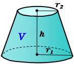 \(\normalsize Circular\ truncated\ cone\\ (1)\ volume:\hspace{10px} V={\large\frac{1}{3}}\pi({r_1}^2+r_1r_2+{r_2}^2)h\\ (2)\ lateral\ area:\\ \hspace{90px} F=\pi(r_1+r_2)\sqrt{(r_1-r_2)^2+h^2}\\ (3)\ surface\ area:\\ \hspace{90px} S=F+\pi({r_1}^2+{r_2}^2)\\\)