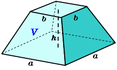 \(\normalsize Truncated\ square\ pyramid\\ (1)\ volume:\hspace{45px} V={\large\frac{1}{3}}(a^2+ab+b^2)h\\ (2)\ lateral\ area:\ F=2(a+b)\sqrt{({\large\frac{a-b}{2}})^2+h^2}\\ (3)\ surface\ area:\ S=F+a^2+b^2\\\)
