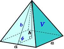 \(\normalsize Square\ pyramid\\ (1)\ volume:\hspace{105px} V={\large\frac{1}{3}}a^2h\\ (2)\ lateral\ area:\hspace{65px} F=a\sqrt{4h^2+a^2}\\ (3)\ surface\ area:\hspace{63px} S=F+a^2\\ (4)\ height\ of\ side\ face:\hspace{20px} b=\sqrt{h^2+({\large\frac{a}{2}})^2}\\ (5)\ angle\ of\ inclination:\hspace{10px} \phi=tan^{\scriptsize{-1}}({\large\frac{2h}{a}})\\ \)
