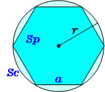 \(\normalsize Regular\ polygons\ inscribed\\ \hspace{200px} to\ a\ circle\\ \hspace{20px} n:\ number\ of\ sides\\ (1)\ polygon\ side:\hspace{25px} a=2r\sin{\large\frac{\pi}{n}}\\ (2)\ polygon\ area:\hspace{10px} S_p={\large\frac{1}{2}}nr^2\sin{\large\frac{2\pi}{n}}\\ (3)\ circle\ area:\hspace{30px} S_c=\pi r^2\\\)