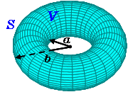 \(\normalsize Torus\\ (1)\ volume:\hspace{50px} V={\large\frac{1}{4}}\pi^2(a+b)(b-a)^2\\ (2)\ surface\ area:\hspace{10px} S=\pi^2(b^2-a^2)\\\)