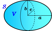 \(\normalsize Ellipsoid\\ (1)\ volume:\hspace{45px} V={\large\frac{4}{3}}\pi abc\\ (2)\ surface\ area:\\ \hspace{30px} S=2\pi\left(c^2+abxE(x,k)+{\large\frac{bc^2}{ax}}F(x,k)\right)\\ \hspace{30px} x=\sqrt{1-{\large\frac{c^2}{a^2}}}\ ,\hspace{10px}k={\large\frac{\sqrt{1-{\large\frac{c^2}{b^2}}}}{x}},\hspace{10px}a\ge b\ge c\\ F(x,k)\ 1st\ incomplete\ elliptic\ integral\\ E(x,k)\ 2{\small nd}\ incomplete\ elliptic\ integral\\\)