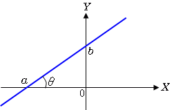 \(\normalsize Linear\ equation\ with\ two\ intercepts\\ \hspace{20px}y=-{\large\frac{b}{a}}x+b\\ \hspace{20px}\theta=\tan^{\tiny -1}({-\large\frac{b}{a}})\\\)