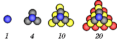 \(\normalsize Tetrahedral\ number\\ (1)\ total\ balls\\ \hspace{40px} T_n={\large\displaystyle \sum_{\small k=1}^n\frac{k(k+1)}{2}}={\large\frac{n(n+1)(n+2)}{6}}\\ (2)\ height\ to\ accumulate\\ \hspace{40px} h_n=\sqrt{\large\frac{2}{3}}(n-1)+1\\ \)