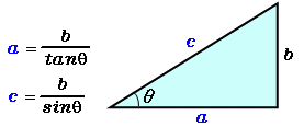 \(\normalsize Right\ triangle\\ \hspace{20px}\cos\theta={\large \frac{a}{c}}\ ,\hspace{20px}\sin\theta={\large \frac{b}{c}}\ ,\hspace{20px}\tan\theta={\large \frac{b}{a}}\\ \)