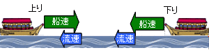 流れのある川を船で上った情報から船の速さや下りの時間を計算する。