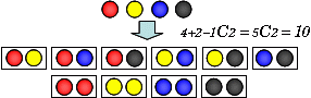 \(\normalsize Combinations\ with\ repetition\\ (1)\ {}_{n+r-1}C_r={\large\frac{(n+r-1)!}{r!(n-1)!}}\\ \)