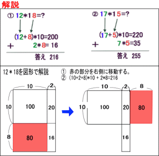 10台(2桁で20未満)の数値どうしの掛け算を簡単に計算できます。インド式暗算で脳を鍛えましょう。