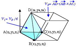 \(\normalsize Parallelepiped\ and\ Tetrahedron\\ (1)\ V_p=\vec{AD}\cdot(\vec{AB}\times\vec{AC})\\ {\small \hspace{18px}= (x_4-x_1)[(y_2-y_1)(z_3-z_1)-(z_2-z_1)(y_3-y_1)] \\ \hspace{18px}+(y_4-y_1)[(z_2-z_1)(x_3-x_1)-(x_2-x_1)(z_3-z_1)] \\ \hspace{18px}+(z_4-z_1)[(x_2-x_1)(y_3-y_1)-(y_2-y_1)(x_3-x_1)]} \\ (2)\ V_t={\large\frac{V_p}{6}}\\\)