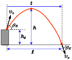 \(\normalsize Parabolic\ motion\ from\ elevation\\\\ (1)\ t={\large \frac{\sqrt{2g(h-h_0)}+\sqrt{2gh}}{g}}\\ (2)\ v_s=\sqrt{({\large\frac{l}{t})^2}+2g(h-h_0)}\\ \hspace{25px}\theta_s=\tan^{\tiny -1}\left({\large\frac{t\sqrt{2g(h-h_0)}}{l}}\right)\\ (3)\ v_e=\sqrt{({\large\frac{l}{t}})^2+2gh}\\ \hspace{25px}\theta_e=\tan^{\tiny -1}\left({\large\frac{t\sqrt{2gh}}{l}}\right)\)