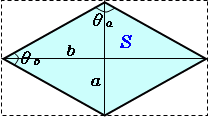\(\normalsize Rhombus \\ (1)\ area:\hspace{65px} S= {\large\frac{ab}{2}}\\ (2)\ perimeter:\hspace{20px} L=2\sqrt{a^2+b^2}\\ (3)\ peak\ angles:\ \theta_a=2tan^{\small -1}({\large\frac{b}{a}})\\ \hspace{126px}\theta_b=2tan^{\small -1}({\large\frac{a}{b}})\\\)
