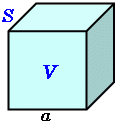 \(\normalsize Cube\\ (1)\ edge\ length:\hspace{20px} a=\hspace{1px} ^{\small3}\sqrt{V}\\ (2)\ surface\ area:\hspace{10px} S=6a^2\\\)