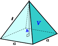 \(\normalsize Square\ pyramid\\ (1)\ height:\hspace{60px} h={\large\frac{\sqrt{4l^2-2a^2}}{2}}\\ (2)\ volume:\hspace{50px} V={\large\frac{1}{3}}a^2h\\ (3)\ surface\ area:\hspace{10px} S=a^2+a\sqrt{a^2+4h^2}\\\)