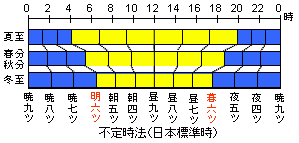・不定時法とは日の出日の入を元に決め、太陽高度が-7.36度の時を明け六つ、暮れ六つとした。