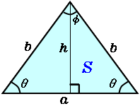 \(\normalsize Isosceles\ triangle\\ (1)\ height:\hspace{50px} h={\large\frac{a}{2}}tan\theta=b\cdot sin\theta\\ (2)\ base\ length:\hspace{10px} a=2b\cdot cos\theta\\ (3)\ area:\hspace{60px}S={\large\frac{1}{2}}ah={\large\frac{1}{2}}b^2sin2\theta\\ \)