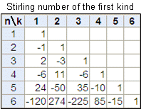 第1種スターリング数 s(n,k) の nが指定された表を計算します。