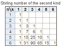 \(\normalsize Stirling\ number\ of\ the\ 2nd\ kind\ S(n,k)\\ (1)\ {\large\displaystyle \sum_{\small k=0}^{\small n}}S(n,k)x(x-1)(x-2)\ldots (x-k+1)=x^n\\ (2)\ S(n,0)={\large\delta}_{n0},\hspace{20px}S(n,1)=S(n,n)=1\\ \hspace{25px} S(n,k)=S(n-1,k-1)+kS(n-1,k),\\ \hspace{240px}1\le k\le n\\ (3)\ S(n,k)={\large \frac{1}{k!} \displaystyle \sum_{\small j=0}^{\small k}}(-1)^{j}{}_{k}C_{j}(k-j)^n\\ \)