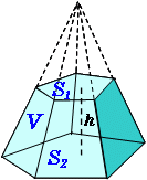 \(\normalsize Frustum\\ (1)\ volume:\hspace{20px} V={\large\frac{h}{3}}(S_1+S_2+\sqrt{S_1S_2})\\\)