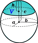 \(\normalsize Ellipsoidal\ cap\\ (1)\ volume:\hspace{50px} V={\large\frac{\pi ab}{3c^2}}h^2(3c-h)\\ (2)\ base\ area:\hspace{30px} B={\large\frac{\pi ab}{c^2}}h(2c-h)\\ \)