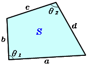 \(\normalsize Bretschneider's\ formula \\ (1)\ area:\ S=\sqrt{(s{\small-}a)(s{\small-}b)(s{\small-}c)(s{\small-}d){\small-}abcd\cos^{\small2}\frac{\theta}{2}}\\ \hspace{100px} s={\large\frac{a+b+c+d}{2}}\ ,\hspace{10px} \theta=\theta_1+\theta_2\\(2)\ perimeter:\ L=2s=a+b+c+d\)