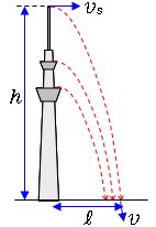 東京スカイツリーや東京タワーなどからの落下での経過時間と落下速度と到達距離を計算します。なお、水平初速度(風速)や空気抵抗は考慮しています。