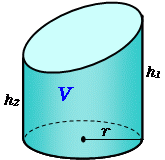 \(\normalsize Oblique\ cutting\ cylinder\\ (1)\ volume:\hspace{53px} V=\pi r^2{\large \frac{h_1+h_2}{2}}\\ (2)\ lateral\ area:\hspace{15px} F=\pi r(h_1+h_2)\\ (3)\ surface\ area:\hspace{10px} S=F+\pi r\left( r+\sqrt{r^2+({\large\frac{h_1-h_2}{2}})^2}\right)\\\)