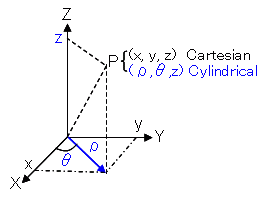 \(\normalsize Transformation\ coordinates\\ \hspace{10px} Cartesian\ (x,y,z)\ \rightarrow\ Cylindrical\ (\rho,\theta,z)\\ \hspace{10px} \rho=\sqrt{x^2+y^2}\\ \hspace{10px} \theta=\tan^{\tiny -1}{\large\frac{y}{x}}\\ \hspace{10px} z=z \\\)