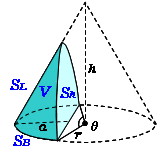 \( \normalsize Partial\ Circular\ Cone\\ \hspace{130px} k=1-{\large\frac{a}{r}}\\ (1)\ center\ angle:\hspace{8px} \theta=2\cos^{\tiny-1}k\\ (2)\ circular\ arc :\ L=r\theta\\ (3)\ chord :\hspace{60px} c=2r\sqrt{1-k^2}\\ (4)\ area:\\ \hspace{30px} S_B={\large\frac{\theta}{2}}r^{2}-rk{\large\frac{c}{2}}\\ \hspace{30px} S_L=r\sqrt{r^2+h^2}\left\{{\large\frac{\pi}{2}}-\sin^{\tiny-1}k-k\sqrt{1-k^2}\right\}\\ \hspace{30px} S_h=hr\left\{\sqrt{1-k^2}-k^2\cosh^{\tiny-1}{\large\frac{1}{k}}\right\}\\ (5)\ volume:\\ \hspace{30px} V={\large\frac{hr^2}{3}}\left\{{\large\frac{\pi}{2}}-2k\sqrt{1-k^2}-\sin^{\tiny-1}k+k^3\cosh^{\tiny-1}{\large\frac{1}{k}}\right\}\\ \)
