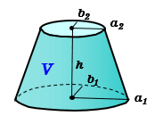 \(\normalsize Truncated\ elliptic\ cone\\ (0) upper\ semi-axis:\hspace{15px} b_{2} = \frac{b_{1}a_{2}}{a_{1}} \\ (1) volume:\hspace{53px} V= \frac{\pi b_{1}h }{3 a_{1} } ( a_{1}^{2} + a_{1}a_{2} + a_{2}^{2} ) \\ (2) lateral\ area: \\\ \hspace{15px} F= \left ( 2 a_{1} \sqrt{b_{1}^2+ \left( \frac{h a_{1}}{a_{1}-a_{2}} \right)^{2}} - 2 a_{2} \sqrt{ \frac{b_{1}^2 a_{2}^{2}}{a_{1}^{2}} + \left( \frac{h a_{2}}{a_{1}-a_{2}} \right)^{2}} \right ) E \left( \sqrt{ \frac{1- \frac{b_{1}^{2}}{a_{1}^{2}} }{ 1 + \frac{b_{1}^{2} (a_{1}-a_{2})^{2}}{h^2 a_{1}^{2} } } } \right) \\\ \hspace{400px} ( a_{1} \gt b_{1} ) \\\ \\\ \hspace{30px} = \left ( 2 b_{1} \sqrt{a_{1}^2+ \left( \frac{h a_{1}}{a_{1}-a_{2}} \right)^{2}} - \frac{ 2 b_{1} a_{2} }{a_{1}} \sqrt{ a_{2}^{2} + \left( \frac{h a_{2}}{a_{1}-a_{2}} \right)^{2}} \right ) E \left( \sqrt{ \frac{1- \frac{a_{1}^{2}}{b_{1}^{2}} }{ 1 + \frac{(a_{1}-a_{2})^{2}}{h^2} } } \right) \\\ \hspace{400px} ( a_{1} \lt b_{1} ) \\\ \\\ E(k)\ :\ 2{\small nd}\ complete\ elliptic\ integral\\ \\ \\ (3) surface\ area:\hspace{10px} S=F+\pi a_{1} b_{1} + \pi a_{2} b_{2} \\\)
